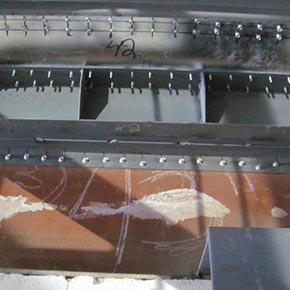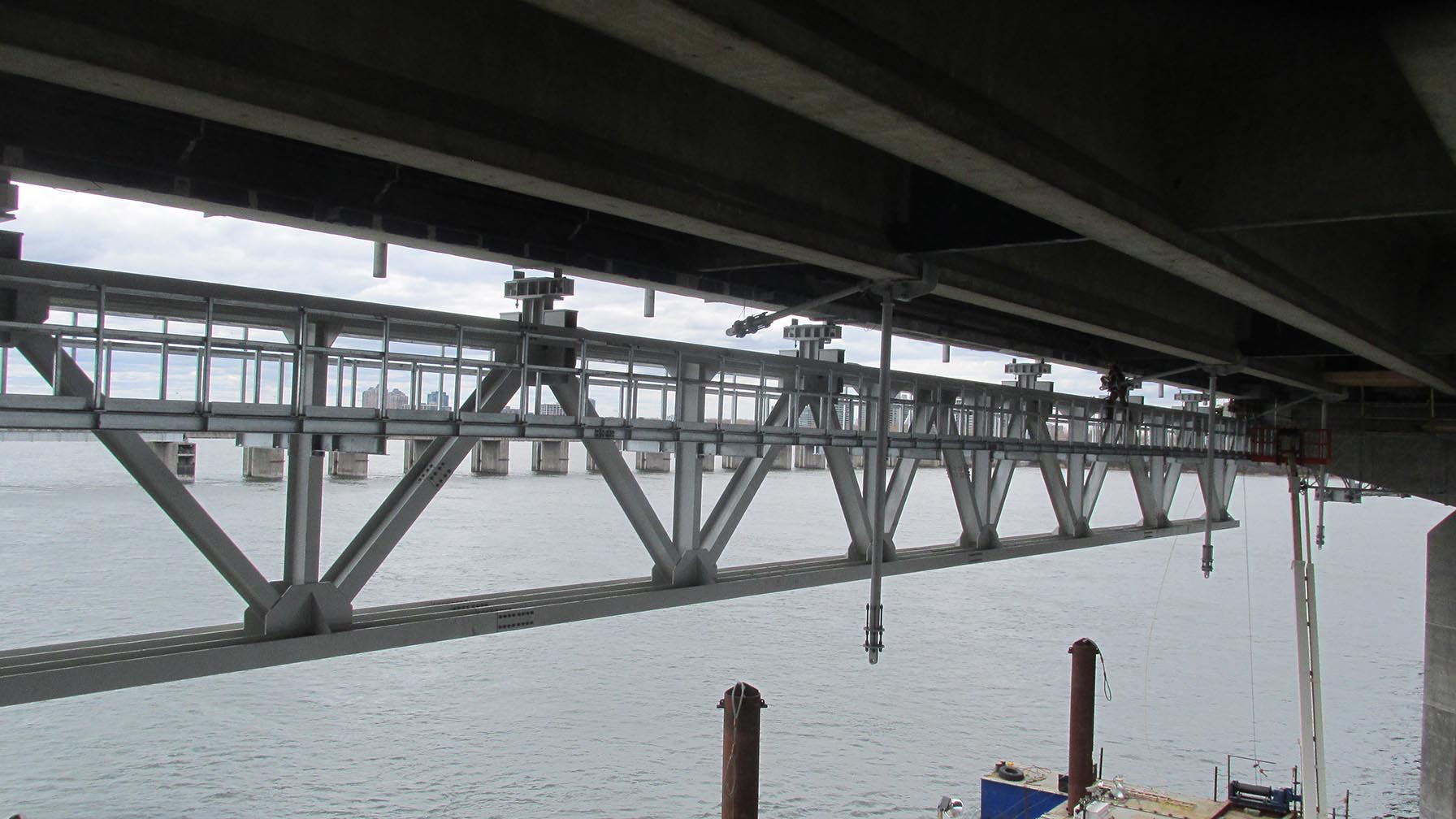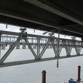 We visually examine the structural condition and, if necessary, load the device. We examine welds susceptible to cracking with Magnetic particle testing and examine pins and shafts with dye penetrant or ultrasound testing in articulated joints.